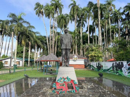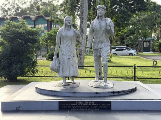 Baba y Mai (Baba and Mai) fue inaugurado en 1994 para honrar a los primeros inmigrantes indios que llegaron el 5 de junio de 1873 para trabajar en las plantaciones de azúcar bajo duras condiciones tras la abolición de la esclavitud. El monumento de aluminio representa a un padre (baba) y una madre (Mai) con traje tradicional, simbolizando la unidad familiar y la contribución de la comunidad indostaní al desarrollo del país. 💰 El acceso es gratuito (espacio al aire libre). ⏱ Abierto 24 horas. 📬 Situado en Kleine Combéweg, en el centro de Paramaribo, Surinam.