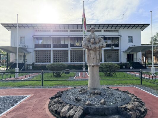 El Monumento a la Madre Surinam (Monument voor Moeder Suriname), escultura en bronce, realizada por el artista Jozef Klas, representa una figura femenina con un sombrero redondo que sostiene a cinco niños en sus brazos, simbolizando a la madre patria con sus distintos grupos étnicos. El monumento fue inaugurado oficialmente por la reina Juliana de los Países Bajos el 15 de octubre de 1965.💰 El acceso es gratuito (espacio al aire libre). ⏱ Abierto 24 horas. 📬 Localizada en Kleine Waterstraat, Paramaribo, Surinam.